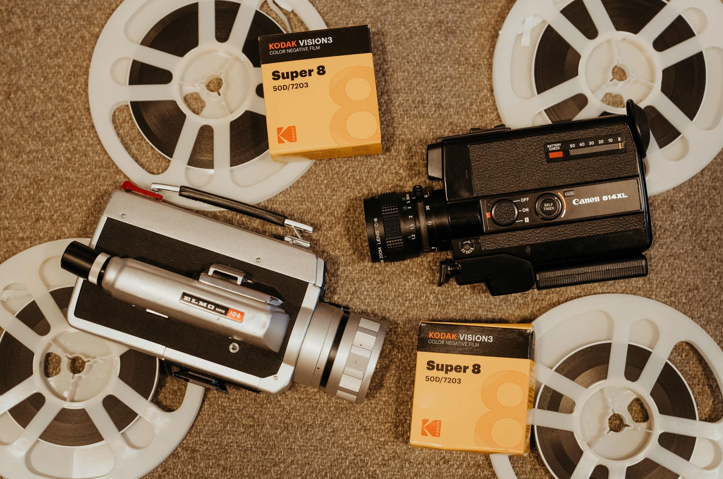 Our Super 8 films are shot on our vintage Elmo 104 and Canon 514XL Super 8mm cameras. In a pinch, we have had to switch to digital if the weather doesn’t cooperate—these cameras are true antiques—in which case, we will recreate the classic Super 8 look in post. We only do this as a last resort—plus, we always aim to get some backup digital footage in case something happens to your film.